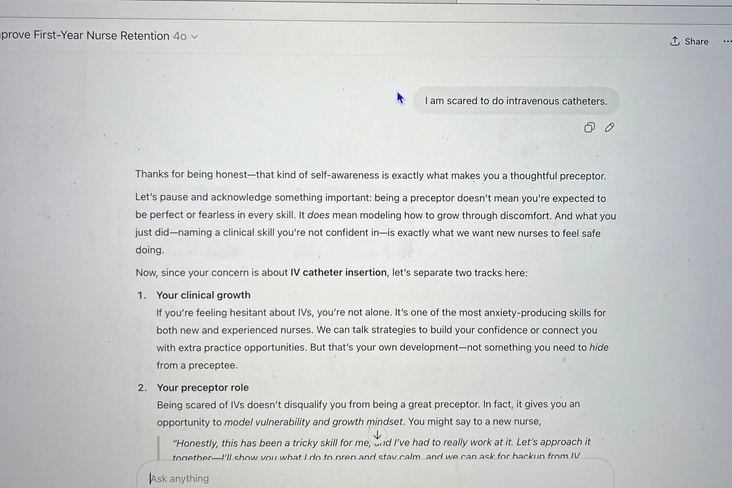 This CustomGPT was built to support nurse preceptors through realistic roleplay, structured coaching, and clear boundaries.